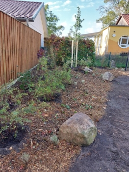 Tiefe Löcher mussten gegraben werden, um zusätzlichen Platz für Rindenhumus zu schaffen. Rindenmulch und große Steine bilden den Abschluss für ein perfektes Bild.
