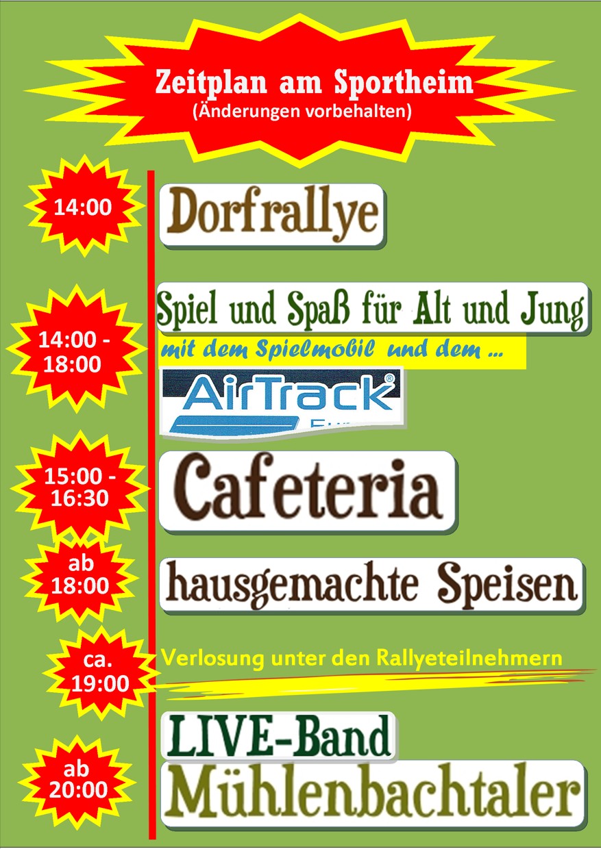 Wer Lust hat, kann an der Dorfrallye teilnehmen. Sie startet am Sportheim und führt durchs Dorf. Hier sind einige Stationen vorbereitet, an denen man spielerisch kleine Aufgaben erfüllt und dabei unseren Ort erkundet.