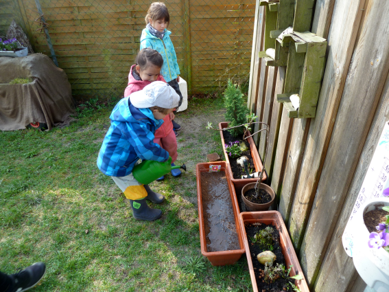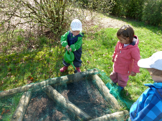 Die Kinder verteilten neue Erde in die einzelnen Abschnitte und brachten die Saat aus. Viele Tiere tauchten unter der Grasnarbe auf und faszinierten die Kinder. Gespannt schauten sie regelmäßig nach, ob sich schon etwas tat. Am Anfang brauchte die Saat täglich Wasser, denn wir hatten eine trockene Zeit erwischt. Ohne direkten Wasseranschluss ist das sehr mühsam. Doch nach ca. 10 Tagen kamen die Kinder voller Freude und berichteten, dass die ersten zarten Blättchen zu sehen sind.