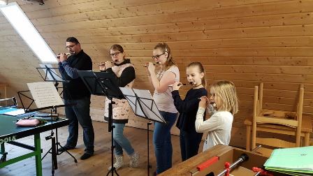 Nachdem die Küche aufgeräumt und sauber gemacht wurde, wurden Gesellschaftsspiele gespielt bevor die Bettruhe beginnen sollte. Das Wecken war für 7.30 Uhr vorgesehen, wurde aber von einigen Leuten auf 6 Uhr vorverlegt. Diese waren der Meinung, es wäre die richtige Zeit um Tischfußball zu spielen. Nach dem Frühstück ging es los. In dem großen Haus haben sich viele kleine Gruppen gebildet, um Satzproben durchzuführen. Zimmer gab es reichlich dafür. Zur Überraschung vieler kam aus unserem befreundeten Spielmannszug Müden/Aller Michael, der uns bei den Ausmärschen unterstützt, um mit uns zu üben. Zwischendurch gab es zur Abwechslung auch Rhythmusspiele, damit der Kopf auch wieder klar werden konnte. Nach dem Mittagessen wurde noch einmal eine Satzprobe durchgeführt und danach gemeinsam musiziert, bevor es nach draußen ging. Es sollte eine Schnitzeljagd stattfinden. Leider hat das nicht so ganz geklappt, wie es vorgesehen war. Dafür haben wir aber einen ganz tollen und großen Spaziergang gemacht bis alle müde und kaputt waren. Als es dunkel wurde gab es auch die obligatorische Nachtwanderung, die für einige kürzer und für andere länger ging. Die ganz müden Krieger sind gar nicht erst mitgegangen. (Habe ich schon den Spaziergang am Nachmittag erwähnt?) Nach dem Frühstück am Sonntag haben alle noch gemeinsam Musik gemacht, bevor es ans Aufräumen und Saubermachen ging. Zum Abschluss gab es noch ein Gruppenfoto und dann sind wir zurück nach Hause gefahren. Es war ein tolles Wochenende und wir hatten alle sehr viel Spaß und haben viel gelernt.