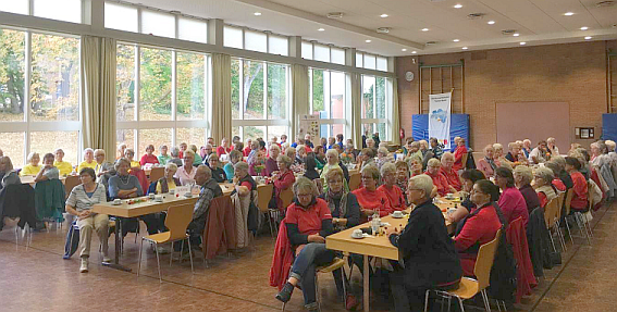 Gut gelaunt trafen alle gegen 16:00 Uhr wieder in der Glockenkolkhalle zum geselligen Beisammensein ein. Hier folgte nach dem Dank an die Helfer erst einmal eine Stärkung. Der zwischenzeitlich eingetroffene Vorsitzende des Kreissportbundes Hartmut Ostermann, sowie der Vizepräsident des NTB, Christoph Hannig, drückten während ihrer Grußworte ihre Freude über den sehr schönen Veranstaltungsort und die große, begeisterte Teilnehmerzahl aus. Der Vorsitzende des TuS Eschede, Niels Mertens lobte das Engagement der Älteren in den Vereinen, die diese demnächst überleben ließen.