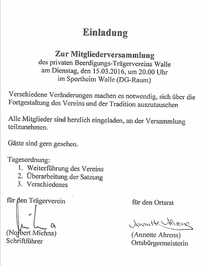 Ort: Sportheim Walle (neuer Dorfgemeinschaftsraum), 19 Uhr