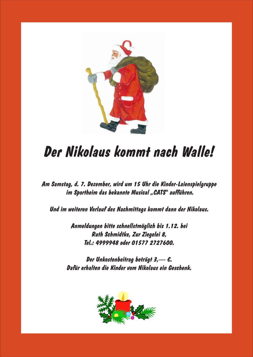 Ebenfalls ist der kulturelle Teil in Walle im vergangenen Jahr nicht zu kurz gekommen. Neben den traditionellen Veranstaltungen wie Schützenball, Schützenfest und Buschfest sowie dem alljährlichen Ortspokalschiessen nebst Wurstessen hat uns die Laienspielgruppe Walle am zweiten Adventswochenende erfreut. Das Kindermusical Cats ist von den Kindern sehr professionell einstudiert worden und auch bei den Erwachsenen mit ihrer Komödie „Vater gesucht“ konnte man viel lachen. Und es kam sogar der Nikolaus für die Waller Kinder vorbei und hatte Päckchen in seinem Säckchen.