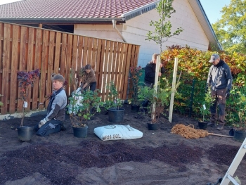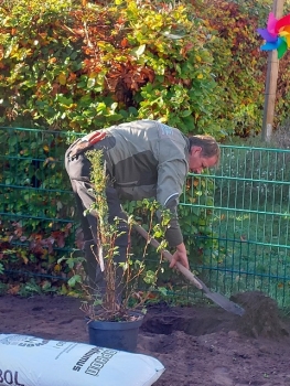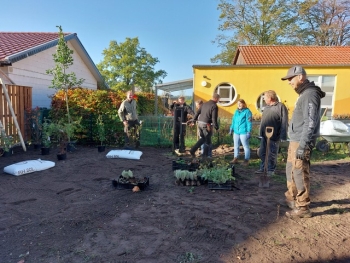Das Ergebnis kann sich mehr als sehen lassen! Eifrig wurden Bäume, Sträucher und Stauden für das Einpflanzen in dem Bereich vor dem Kindergarten vorbereitet.