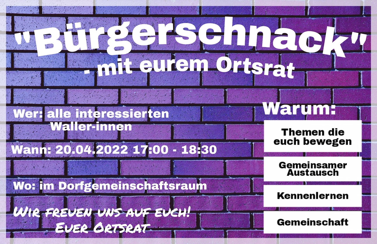 Am 20. April zwischen 17 und 18.30 Uhr sind alle Waller Bürgerinnen und Bürger zum gemeinsamen Gespräch im Dorfgemeinschaftshaus eingeladen.