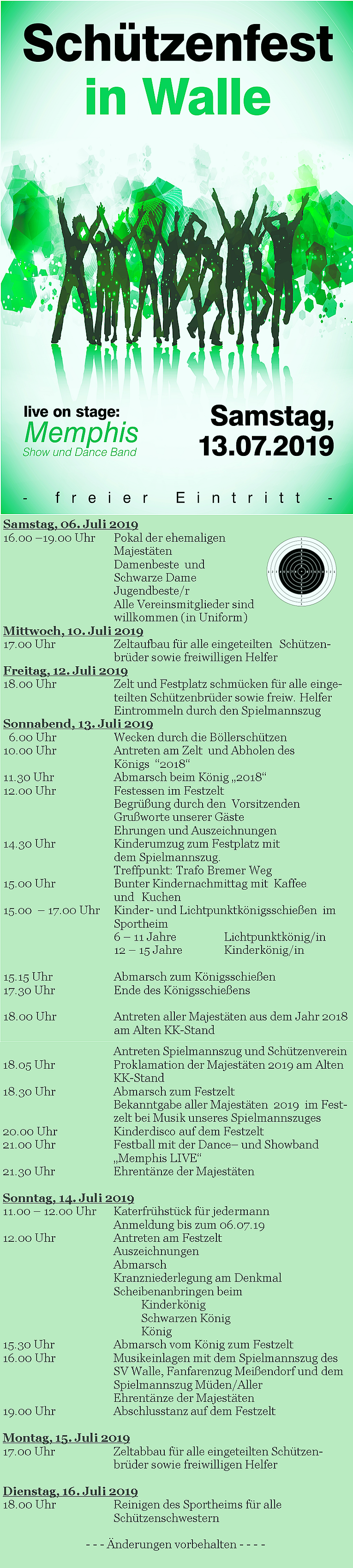 Am Abend wurden die neuen Majestäten in einem vollen Festzelt bei toller Musik von „Memphis“ bis in den Morgen gebührend gefeiert. Die Waller haben es am Abend genossen als über 100 Schützen von den Vereinen aus Wolthausen, Hassel, Hasselhorst, Meißendorf und Winsen ins Zelt einmarschierten und insgesamt über 11 Schüzenvereine zum Feiern anwesend waren.
